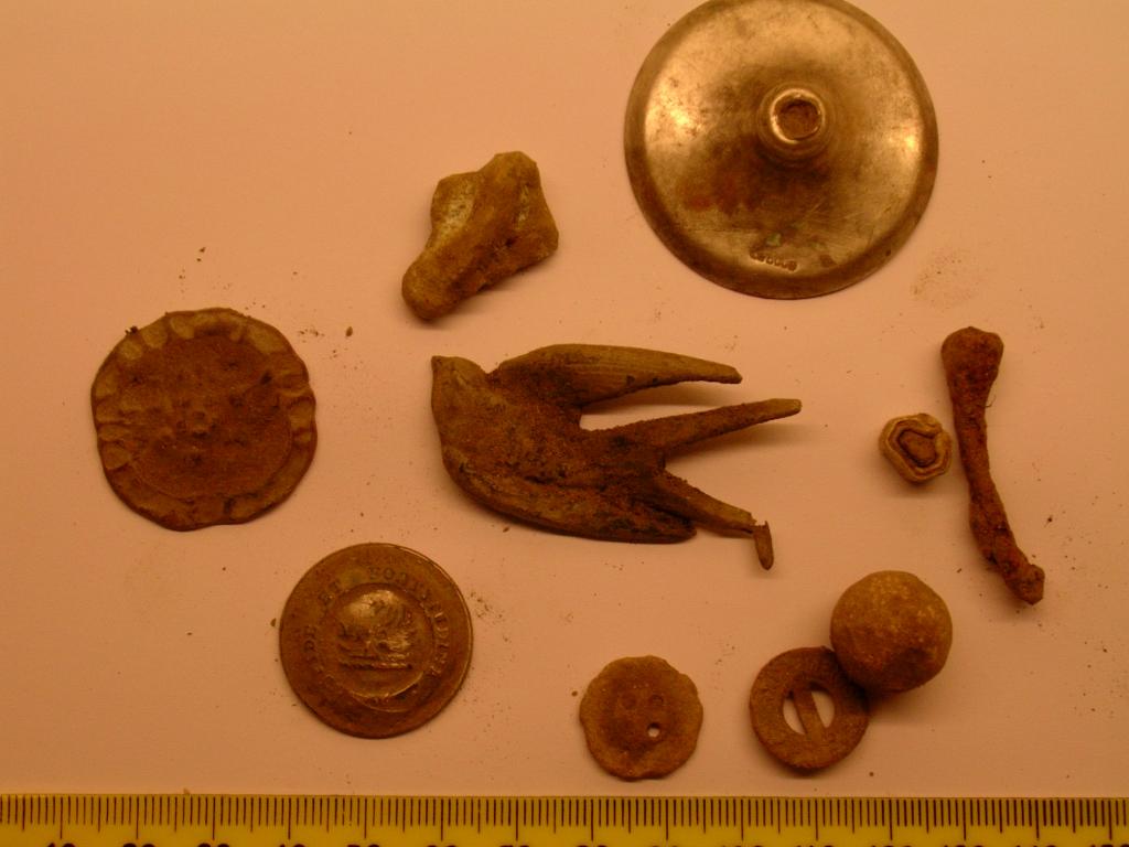 Wieder einnmal Klasse Funde von Dir. Das Objekt ganz oben im Bild könnte ein Fußteller von einem Kerzenständer sein. Allerdings habe ich kene Ahnung bez. der Gravur.