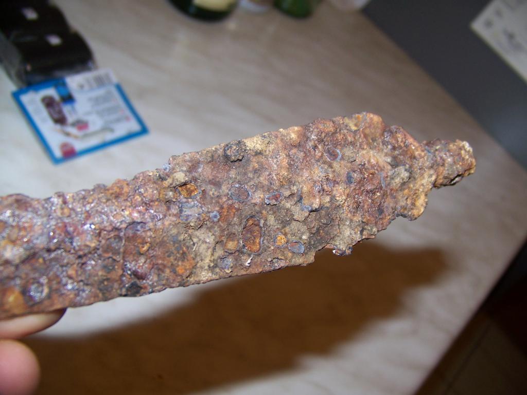 Man sollte das erstmal von groben Rost befreien, außerdem wäre interessant, ob es da hohl ist, wo der Schaft sich befunden haben könnte, zumindest eine Bruchstelle müsste zu sehen sein. Größenangaben wären auch hilfreich. Von den Rostblasen her sieht es nach Gußmaterial aus, Schmiedeeisen rostet in der Regel in blättrigen Schichten, es gibt aber auch Ausnahmen, je nach Legierung und Bearbeitung.
