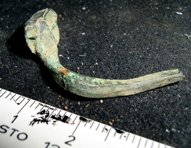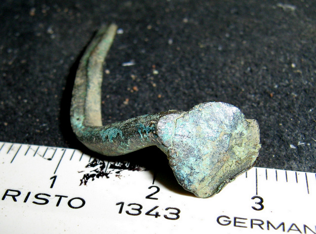 Was mich an dem simplen Fundstück wundert, ist das der Stift nicht zentral dem Kopf angefügt ist, die Fläche, die den Kopf sonst bildet, flächig vom Stift ausgeht.