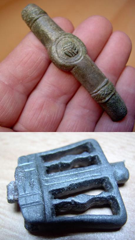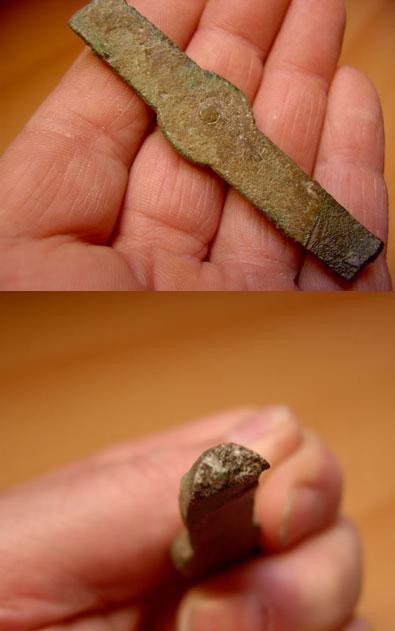 Habe da auch zwei Teile aus bronze gefunden, Könnte das eine ein Stück von einem Schlüssel sein?( etwa 35 x 30 mm), das andere ist abgebrochen an beiden Ende und hat ein kleinen Bogen (75 mm).