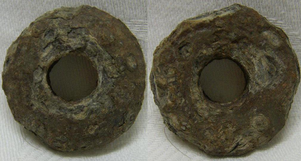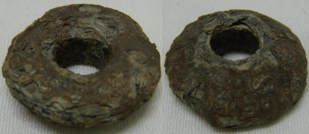 Spinnwirtel wäre schon gut möglich. Die Materialfrage ist aber schwer zu beantworten. Eisen, bei dem der Rost abgeblättert ist?