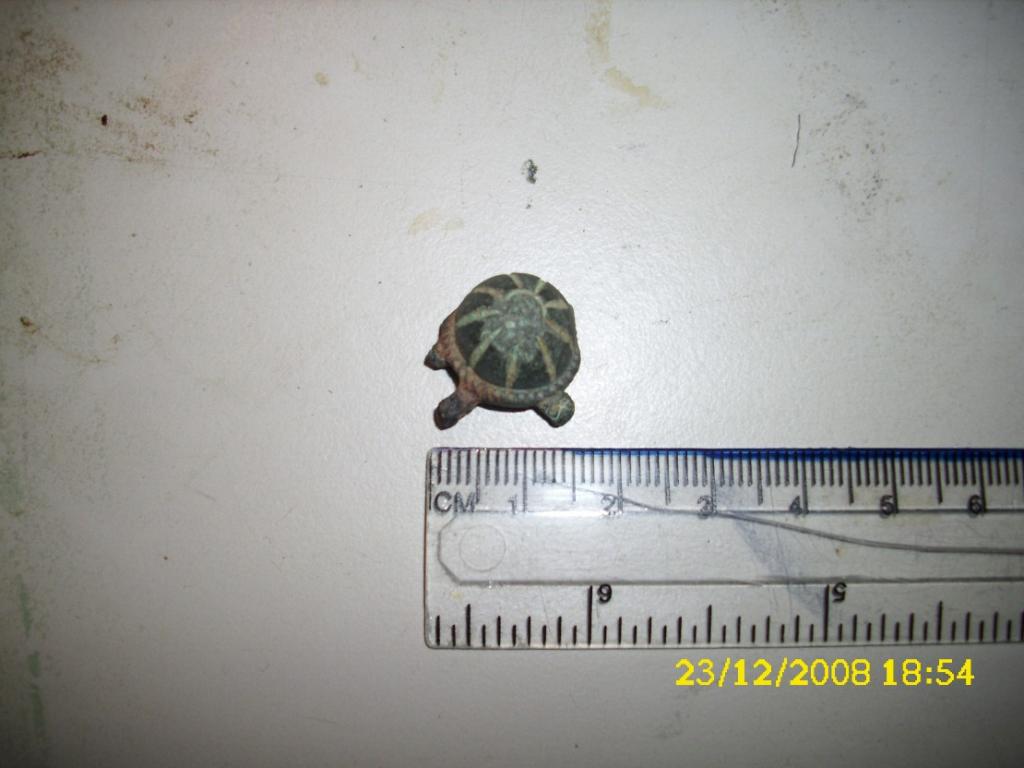 Die kleine Schlidkröte würde ich auch als Spielstein einordnen.Oder als asiatisches Opiumgewicht.Die waren meist in Tierform.Wäre zwar weit gereist,aber nichts ist in der Schatzsuche ausgeschlossen.