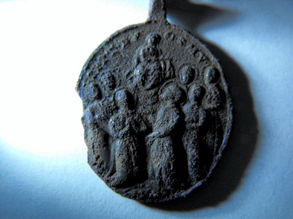 Größe 20,5 mm x 23,5 mm (ohne Öse). Das Motiv dürfte irgend etwas mit Kirche zu tun haben. Auf der einen Seite befindet sich eine sitzende Figur die Schwerter im Arm zu halten scheint. Auf der anderen Seite sind mehrere kniende Personen zu sehen die jemanden über ihnen anbeten. Von der Schrift kann man rechts die Buchstaben O S M V erkennen, links rätsel ich noch. Kann einer von euch mir etwas über Herkunft, Bedeutung und Alter sagen?