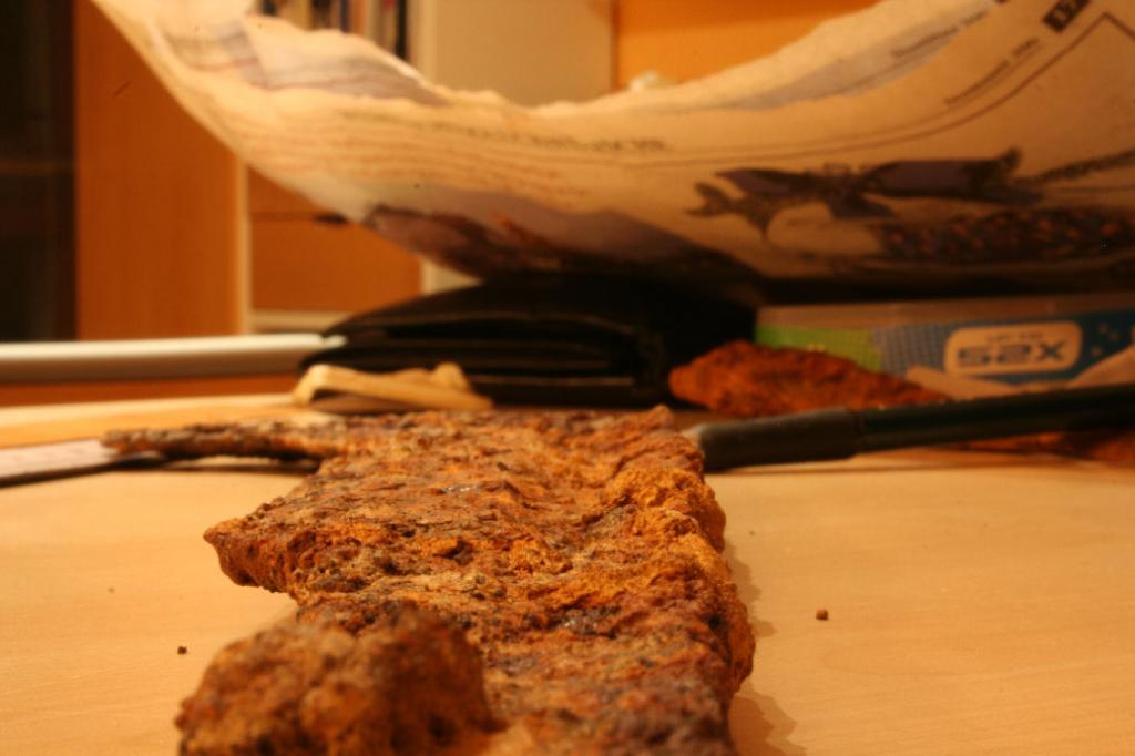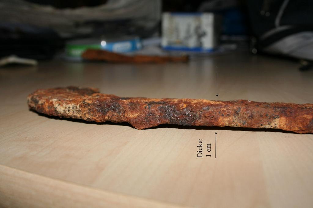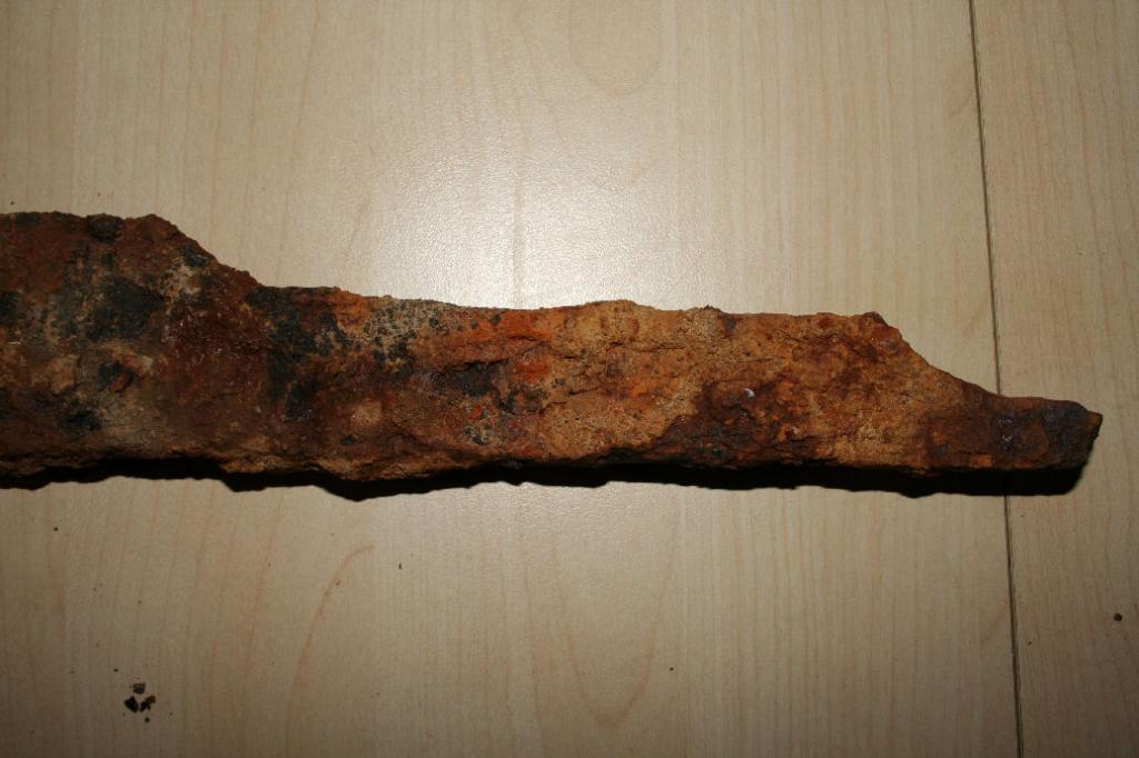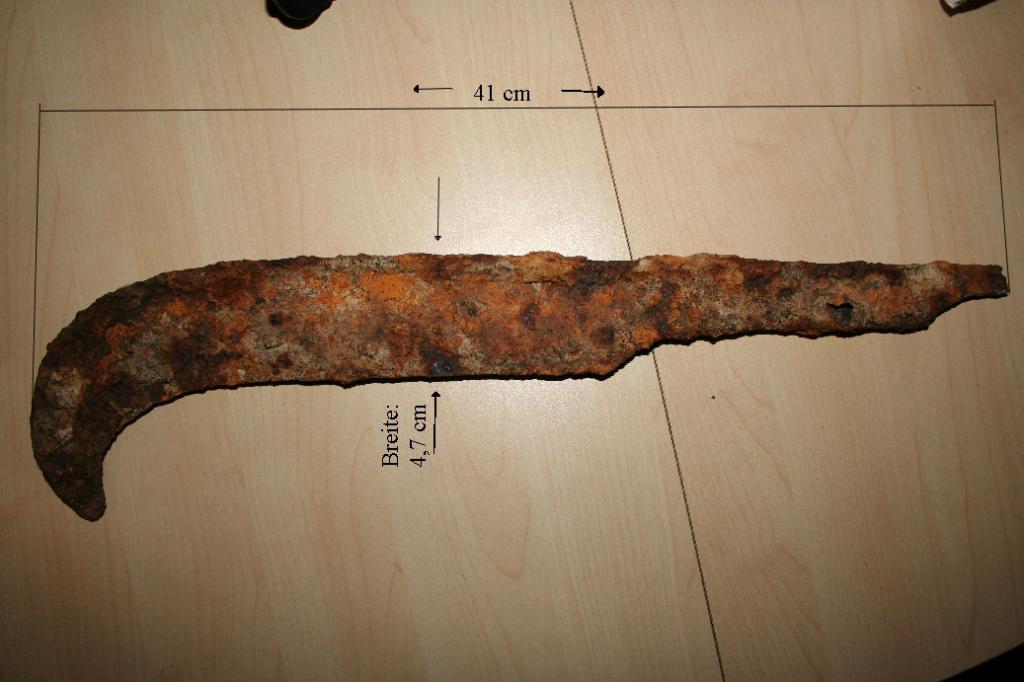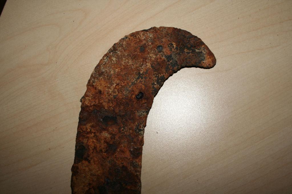 Habe das Teil gestern in einem kleinen Waldstück gefunden. War ca. 20 cm tief im Boden. Es ist aus Eisen, 41 cm lang (am Griff ist ein kleines stück weggebrochen), 4,7 cm breit und der Rücken hat eine stärke von 1 cm. Es sieht mir fast so aus wie eine Sichel, aber ist eine Sichel nicht halbrund ? Vielleicht hat ja einer von euch eine Idee. Ach ja, auf der gesamten länge verläuft eine vertiefung entlang des Rückens aber nur auf einer seite.