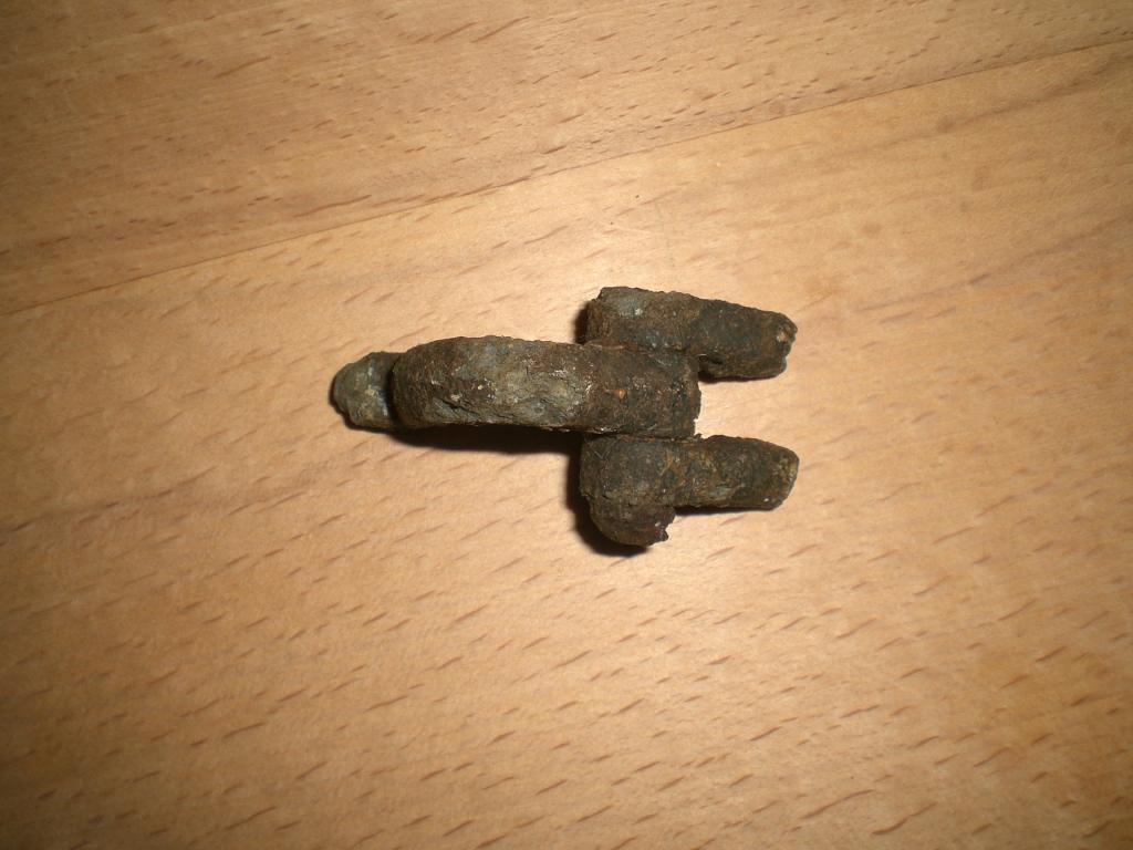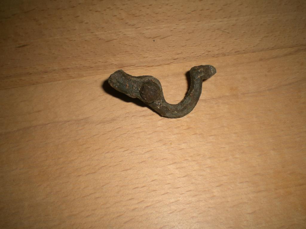 Material scheint Bronze zu sein nur der Stift der mittendurch geht ist aus Eisen.An dem doppelten Ende ist das Teil leider abgebrochen.Schätze mal dass das mal von einem Scharnier oder Riegel o.ä.war Hat jemand von euch noch eine Idee dazu?
