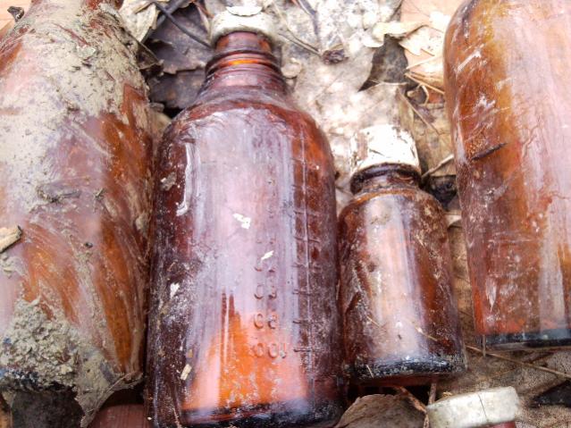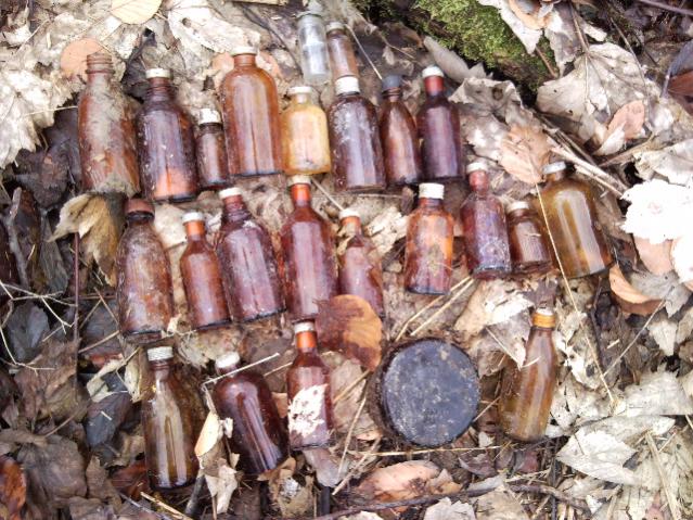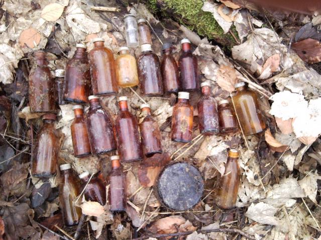Ich habe heute diese Flschen in einem Rechteckigen Loch gefunden, das im WK II durchaus als ein Feldlazarett gedient haben könnte. Das Loch war in den Ausmassen recht groß so um die 5 x 10 Meter und rund 2-3 Meter tief!