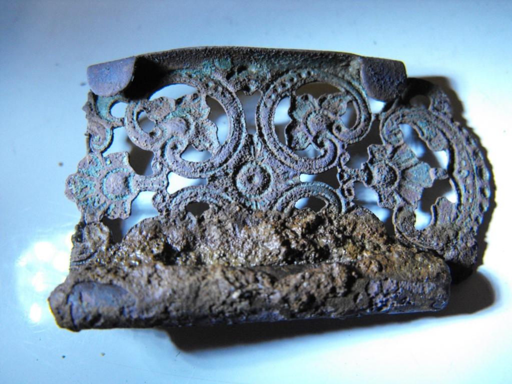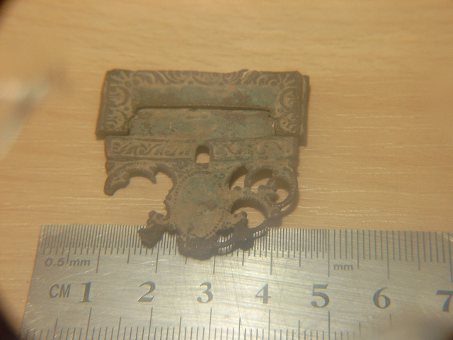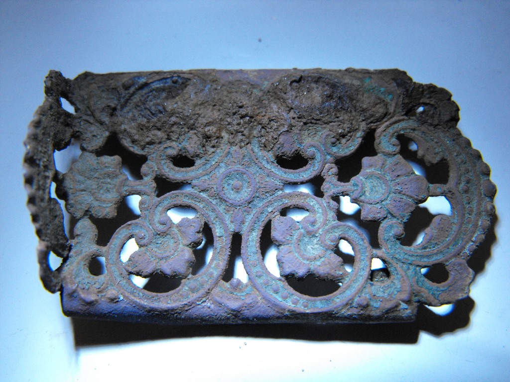 Ein schöner Scheibenknopf, 50 Reichspfennig und ein Teil das ich nicht einordnen kann. Länge 55mm, Breite 28mm, Material vermutlich Kupfer mit einem schönen feinen Muster. Hat einer von euch eine Idee ?