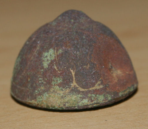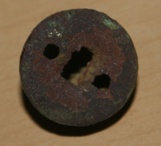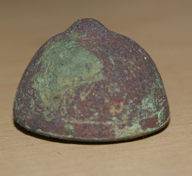 Bei einer meiner letzten Sondengänge habe ich dieses UFO gefunden. Ein Freund sagte mir das es vielleicht ein Römischer Knopf ist, ich bin mir da aber nicht ganz sicher. Da ich meinen meterstab nicht finden kann, kann ich nur ungefähr angaben machen. Der Durchmesser entspricht einer 2 cent Münze und die höhe ungefähr 3/4 dieser Münze. Oben drauf befindet sich eine erhöhung die so aussieht als hätte man mit einem Nagel leicht von innen draufgeschlagen so das es einen spitz ergibt. Rundherum sind rundliche verziehrungen zu erkennen. Bin für jede info dankbar...
