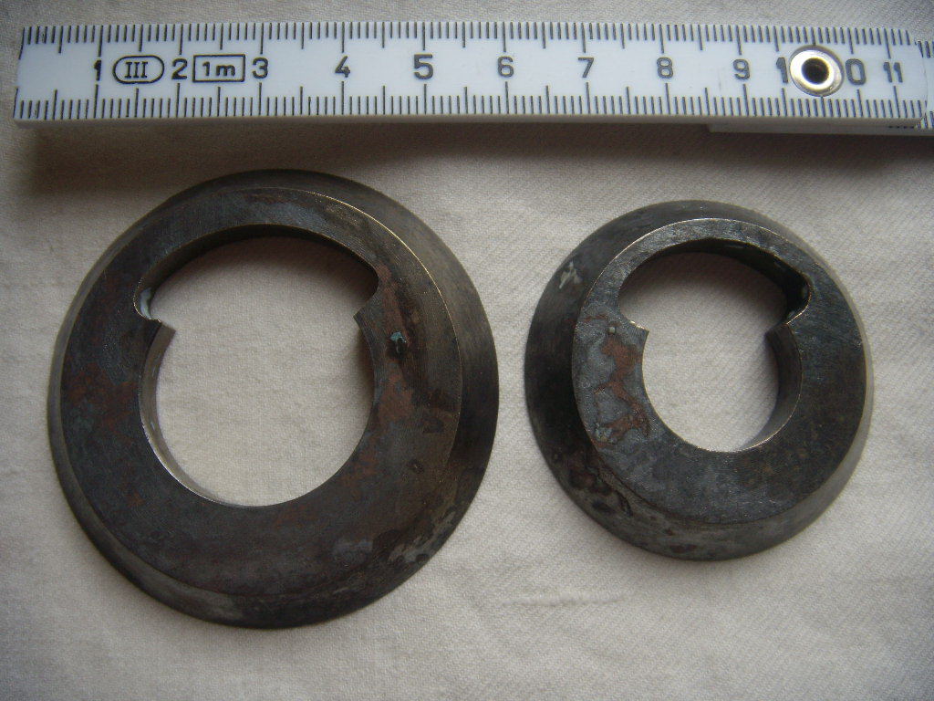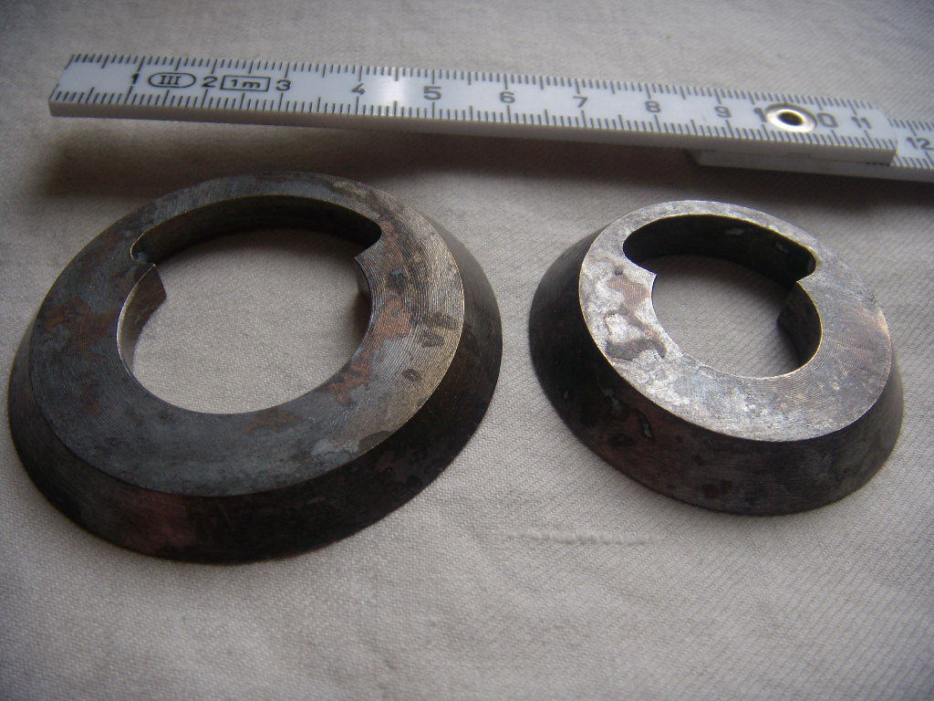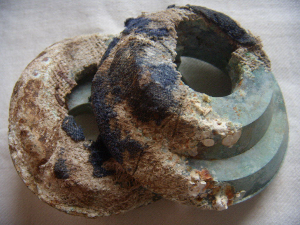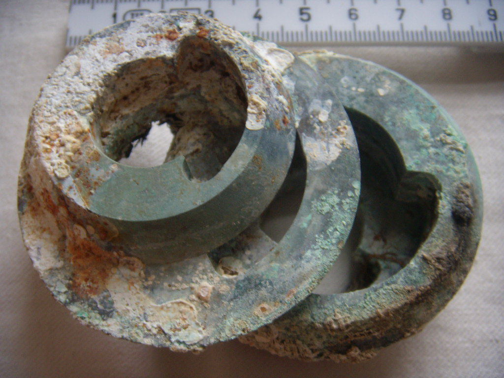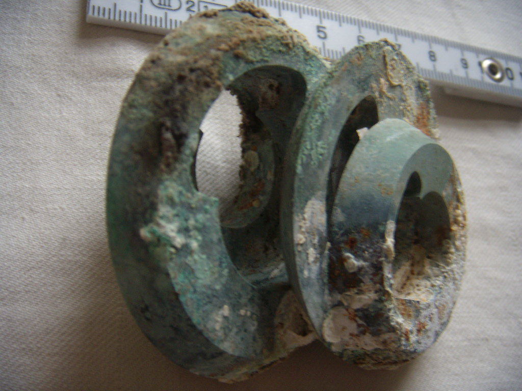 Dieses Teil hier ist ein Deponiefund und lag mindestens seit 1917 in der Erde.Muß abgedeckt gewesen sein;durch einen Topf oä.,deshalb die gute Erhaltung.Es besteht aus 4 speziell geformten Messingringen,die an einer Stelle am Rand mit einer Niete oder Schraube miteinander verbunden sind.