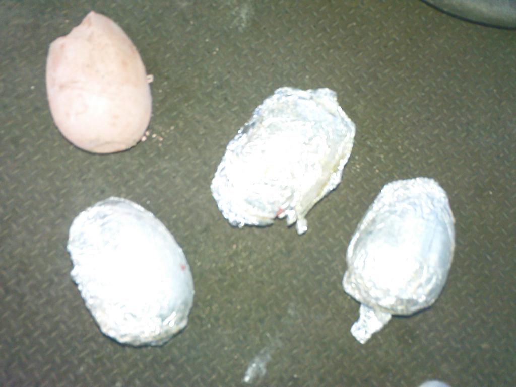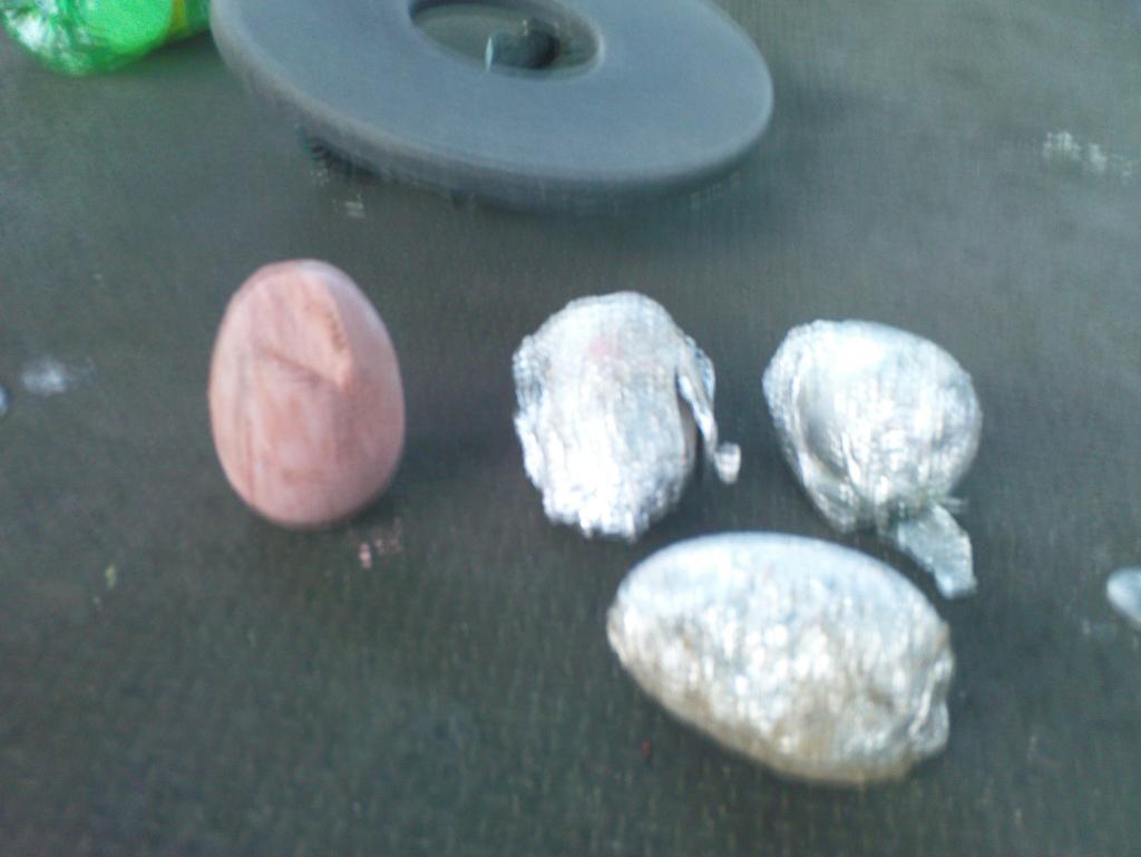 Alufolie, Eierförmige Masse ähnlich Ton riecht wie Erde ,also Muttererde mit leicht chemischen Geruch,jedes Ei hatte ne andere Farbe...