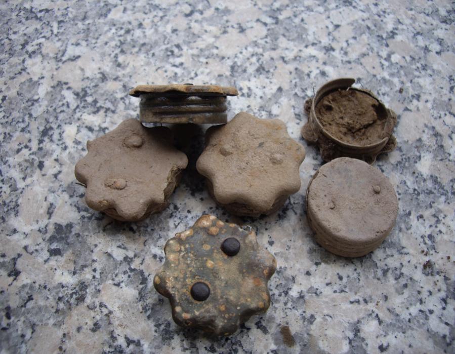 Hier meine Funde die auf der Wiese lagen,geht irgendwie alles in eine andere richtung nur nicht hj.könnt ihr evtl paar Sachen mir bestimmen,diese Sternförmigen Dinger evtl. Schraubkappen Stielhandgranate Wk.1??