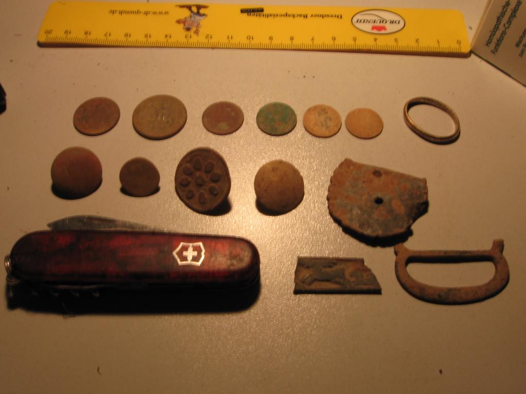 Reihe 3: Schweizer Offiziersmesser (recht neu), Bruchstück eines Messergriffs (da hat "Müllgräber" ja gerade ein schönes Stück gefunden!), Schnallenfragment