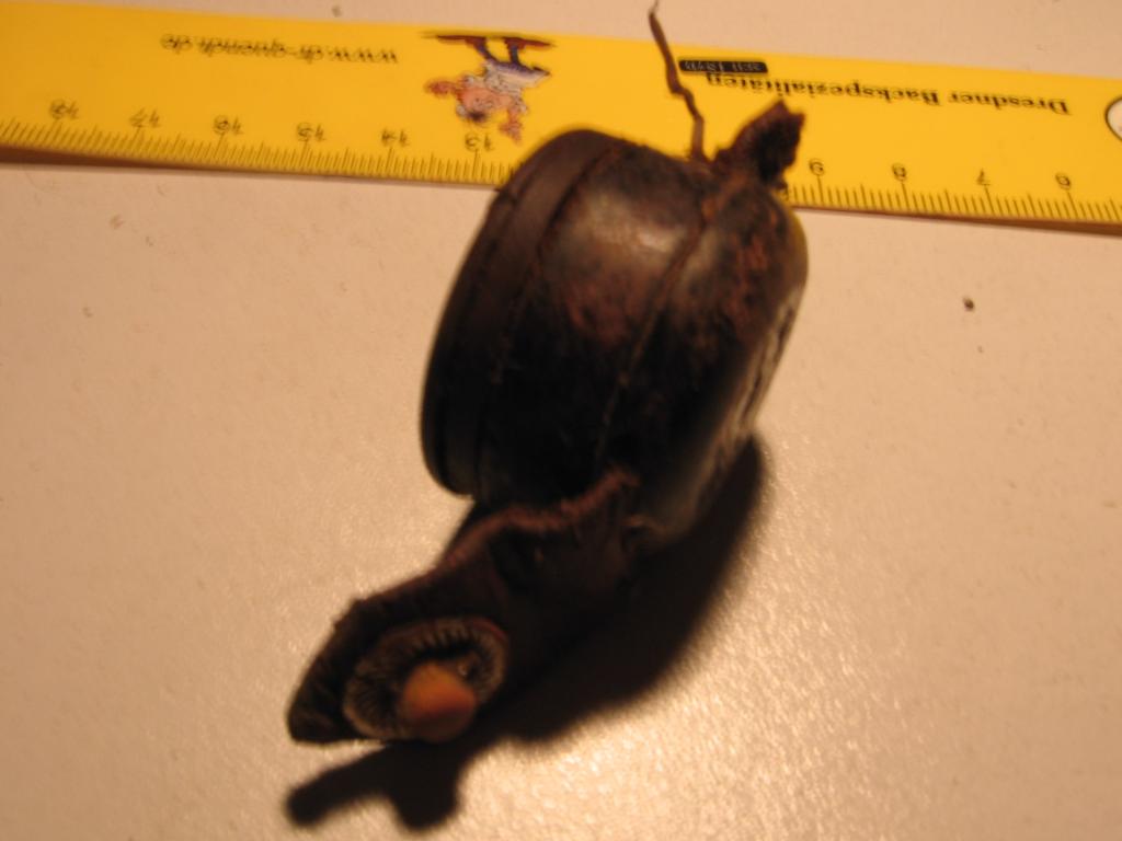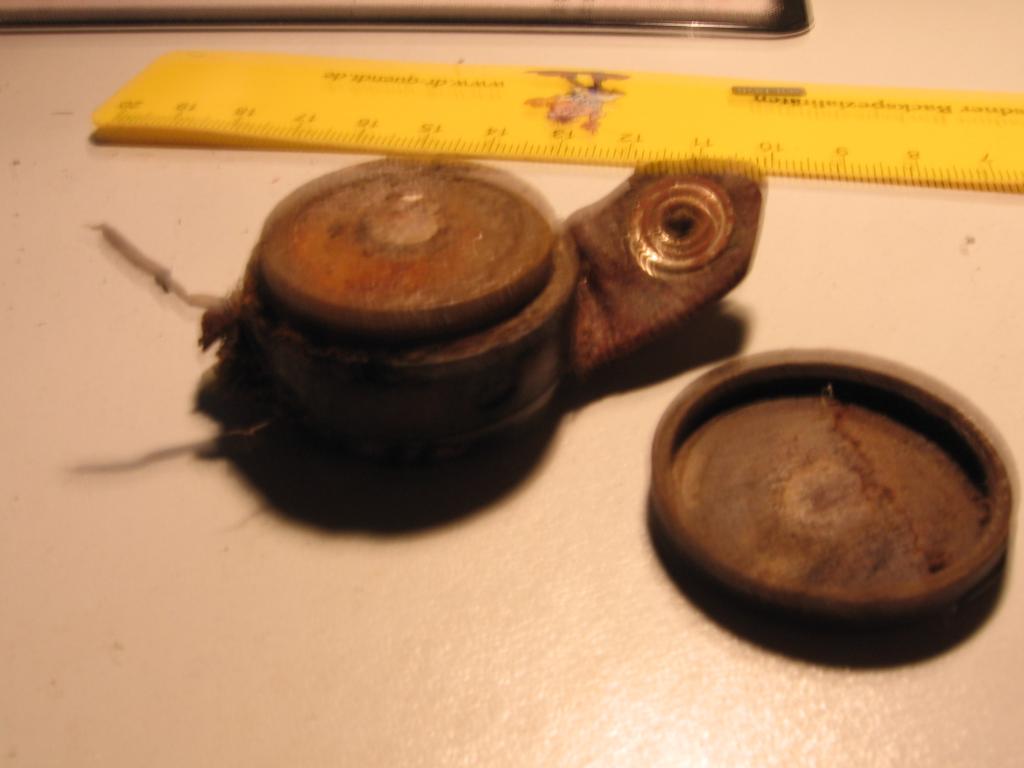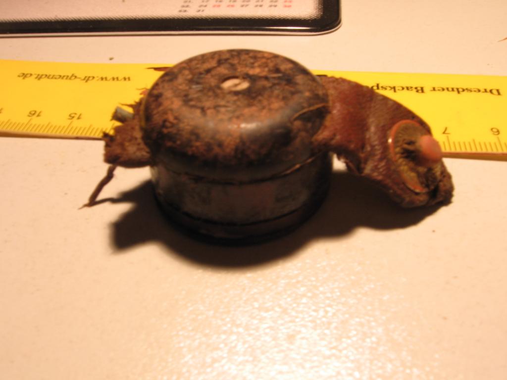 Außerdem gab es da noch dieses Ufo. Ein Döslein (vermutlich Bakelit) mit der Aufschrift Mi4c bxo Ln26779-3. Der durchmesser beträgt 3 cm, die Höhe 2 cm. Es hat einen abnehmbaren Boden, darunter ist eine scheibe mit Rillen am Rand. Der Deckel ist durch ein Schräublein gesichert. Mitten durch ging ein Lederband mit Druckknopf. Bin mal gespannt, was das ist!?