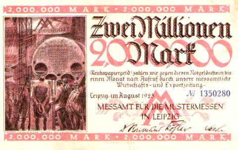 2 Mio Mark Reichspapiergeld, Messamt für die Mustermessen in Leipzig August 1923.