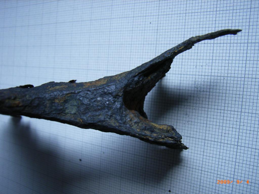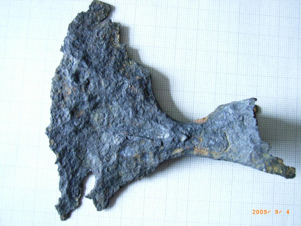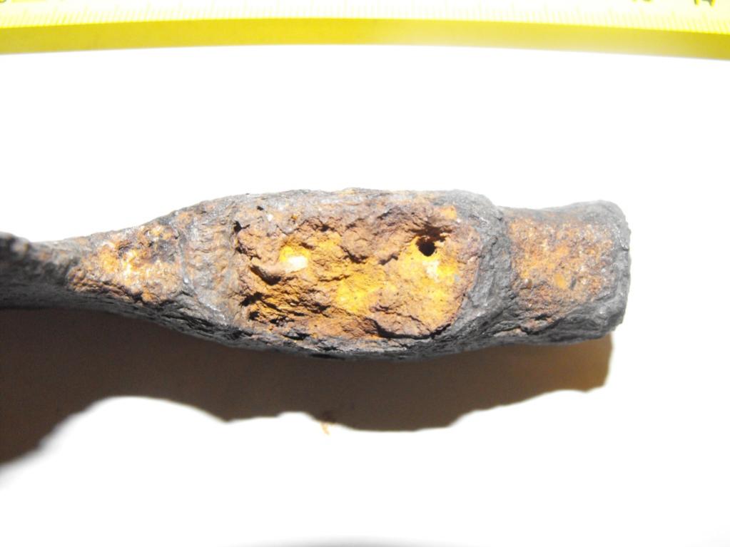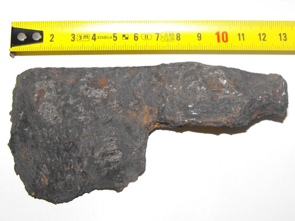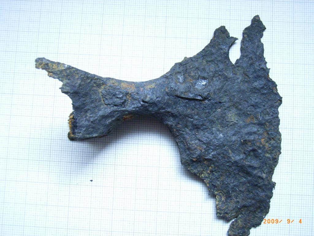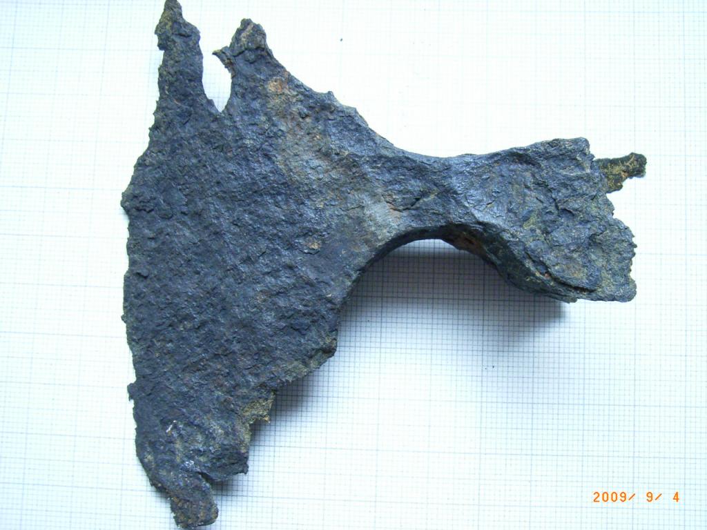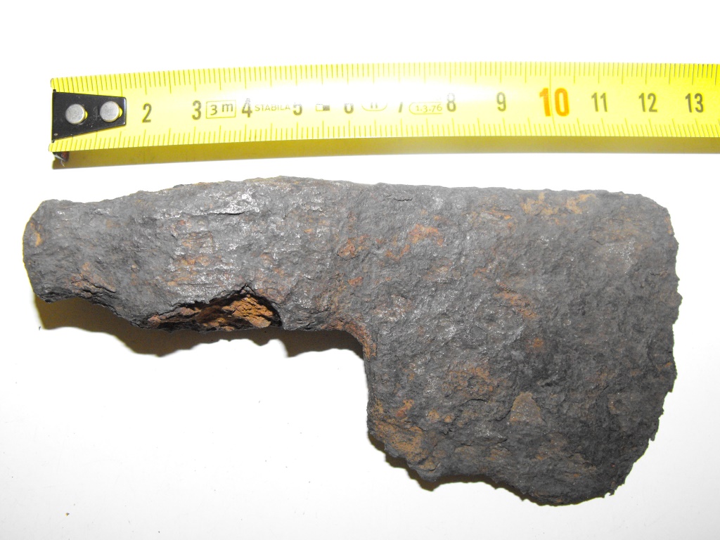 Es ähnelt im Aussehen den kleinen Campingbeilen die sicher viele kennen. Wenn ich den Grad der Korrosion und den bereits vorhandenen Substanzverlust mit andern Teilen aus Schmiedeeisen (z.B. Hufeisen) vergleiche, bin ich davon überzeugt das dieses Beil schon sehr lange im Boden lag. Das Gewicht beträgt noch 234 Gr., war aber mit Sicherheit einmal höher. Auffällig ist die Viereckige Aufnahme für den Stiel, die unten größer ist als oben. Vieleicht kennt jemand von Euch diese Form und kann einen Hinweis zu Alter und Herkunft abgeben. Nur wenige 100 Meter von der Funstelle entfernt, befindet sich eine ca. 1200 Jahre alte Burg/Schlossanlage.