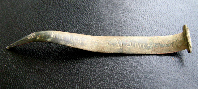 Zum einen habe ich dieses längliche Teil aus dem Erdreich geborgen. Es ist 95 mm lang und erinnert mich an eine Buchschließe. Aber warum so spitz?