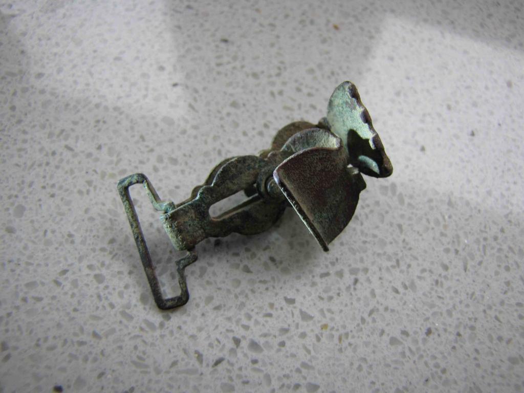 Das erste Teil siht mir nach ner frühen Form von einer Hosenträgerschnalle aus, wo sich die Kralle durch Zug gegen die Platte drückt und so die Hose hält. Kannst Du mal die Rückseite der Schildkröte reinstellen?