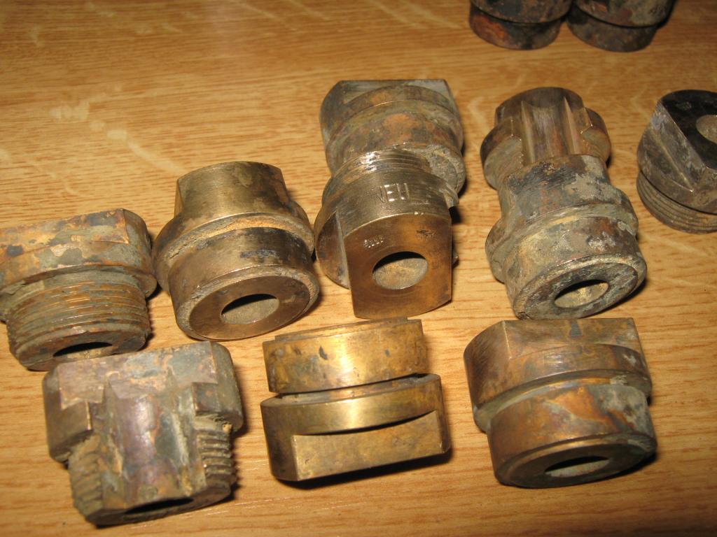 Weiß jemand was das für Teile sind? Die Eisenteile im Vordergrund des ersten Bildes habe ich schon identifiziert ,es geht um die Messinteile.Manche haben ein Feimgewinde und andere nicht,bei einigen ist ein Teil ausgefräst.