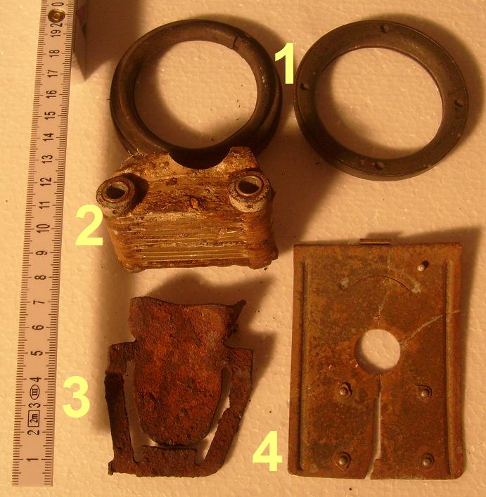 Bild 3 oben sind Gasmaskenringe für die Gläser- drunter meine ich ein Fungeräteteil entdeckt zu haben. Hab bei meinem hiesigen FuGe- Fund einige dieser kleinen dünnen genieteten Alu(?)- oder Zinkplättchen gezogen. Kann aber mit Sicherheit auch viele andere Einsatzmöglichkeiten geben...