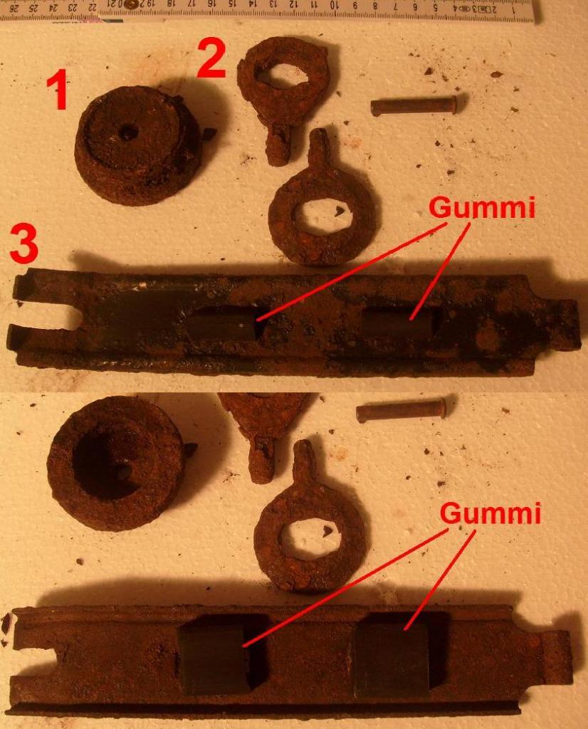 Im Bild die rote Nummer 1 weiss ich das ist ein Adapter für Minenzünder, kann man z.B auf eine 8,8er Sprenggranate schrauben und hat so eine Behelfsmine (mit entsprechenden Zünder). Die rote Nummer 2 sind glaube ich die Befestigungshaken von einer Lkw Plane?