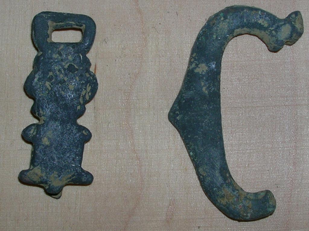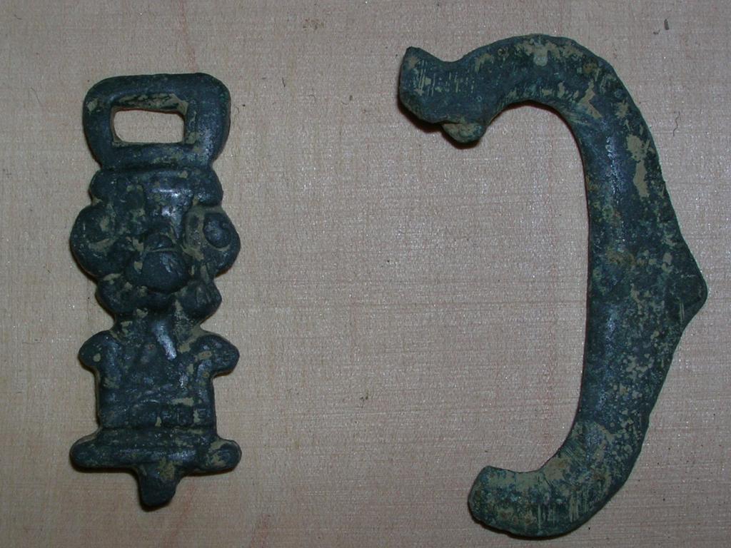 Rechts ein Teil einer Gürtelschnaller, superschöne Patina, wie alt, das kannste hier nachlesen:
