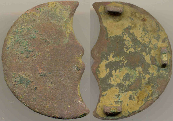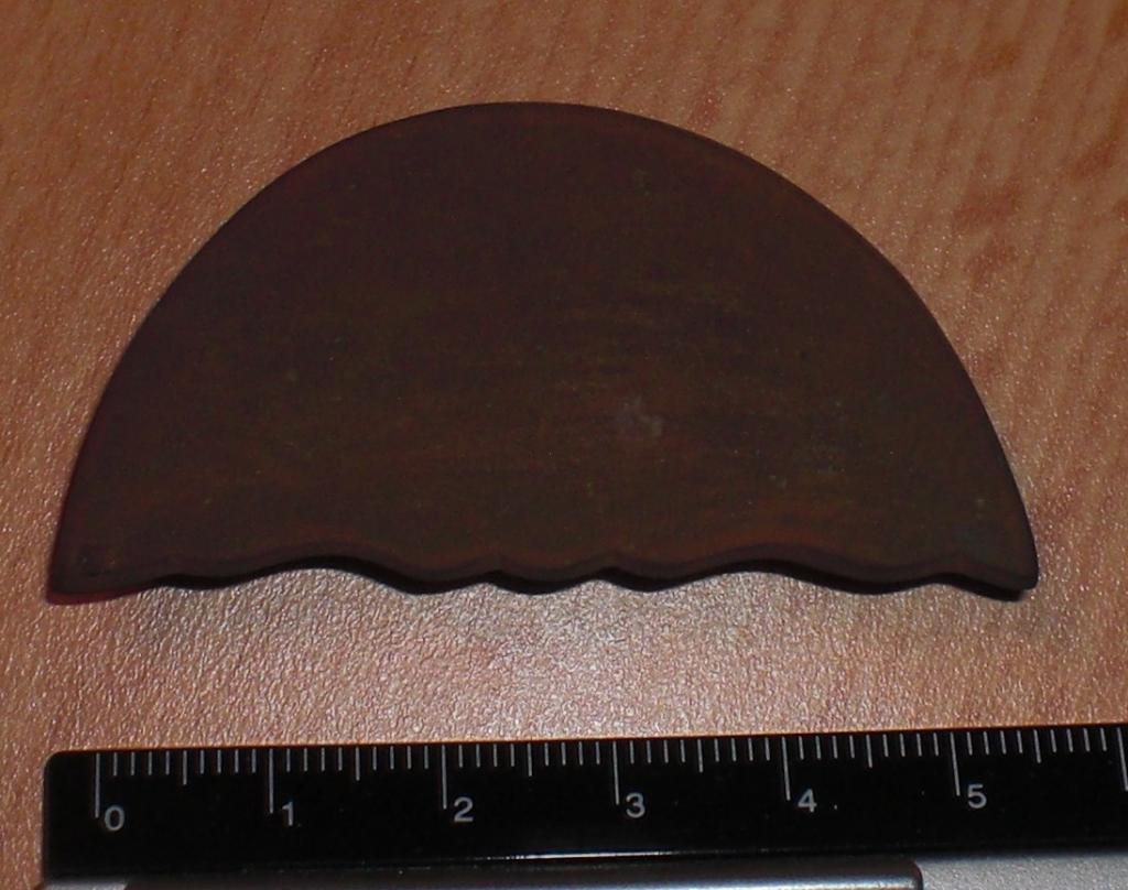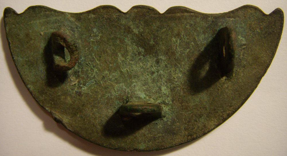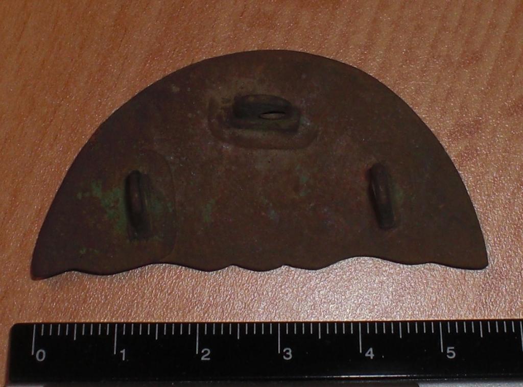 Es gibt ähnliche Stücke aus dünnem Messingblech mit Splinten auf der Rückseite und einem Bördelrand an der halbrunden Kante.Dabei handelt es sich um Abschlußbeschläge für Riemenzungen von Koppel oder Bandeliers.Im Berliner DHM ist sowas zu sehen.