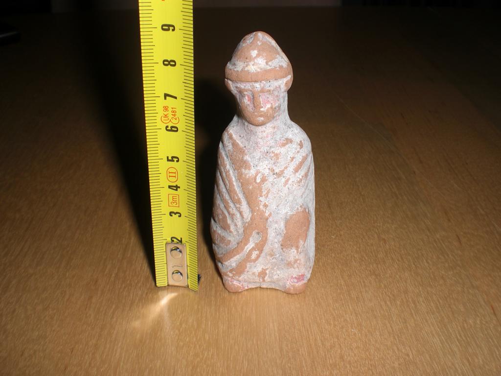 die figur is aus ton und duerfte irgendwann mal rot angemalt gewesen sein, der finder hat sie allerdings denke ich versucht zu reinigen und daher auch die farbe fast überall abgekratzt. höhe ca 9 cm. sie ist männlich hat sowas wie eine toga an und "sitzt" ausserdem hat sie einen ""hut" oder ähnliches auf. sie ist innen hohl, ich hab mal mit einer pinzette hineingekratzt und es kommt weisses pulver plus kleine schwarze partikle, wie haerchen, raus. has mal sicherheitshalber versiegelt.