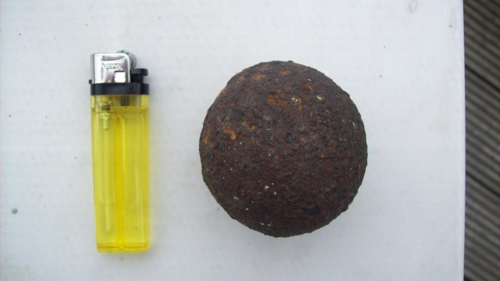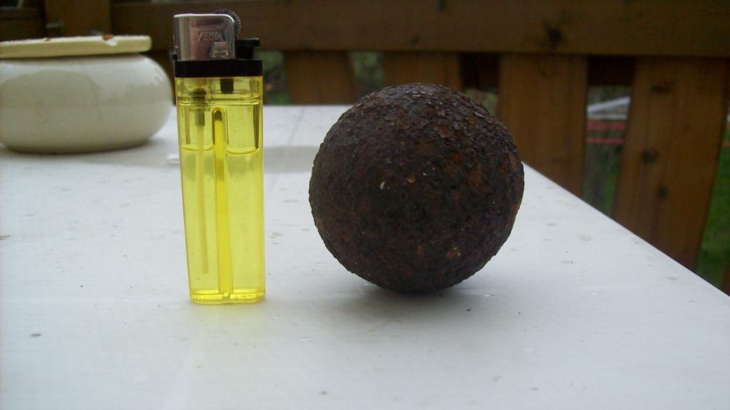 Na also, ein Bild sagt doch mehr als tausend Worte. Der optische Eindruck passt perfekt zu einer Bodenfund-Kanonenkugel. Vollkugel, nicht Kartätsche (bei denen war bei ca. 500g Schluss). Ein Kaliber, dass im 16. und 17. Jh. noch Gang und Gebe war.