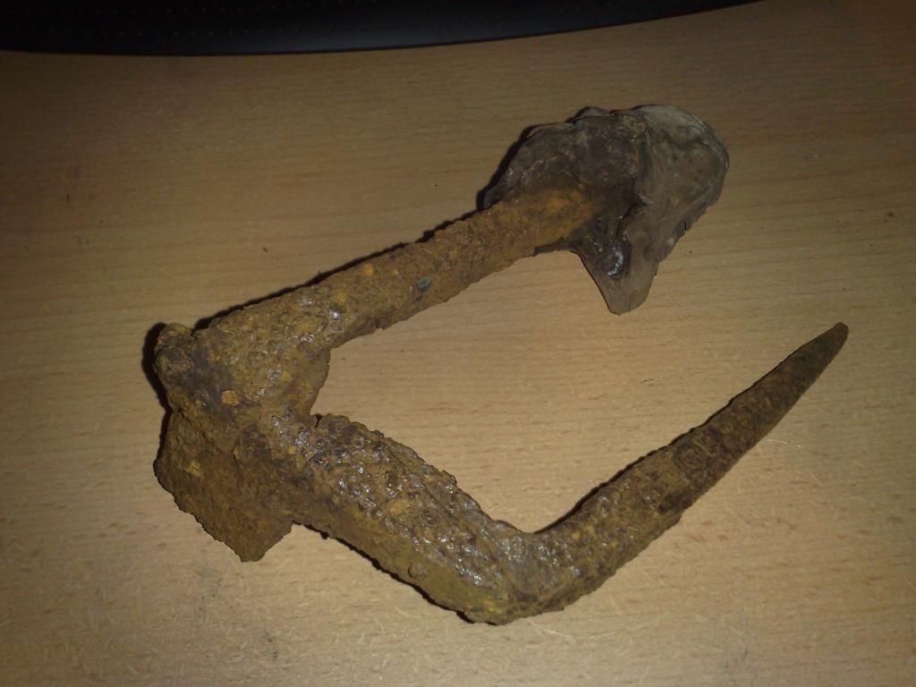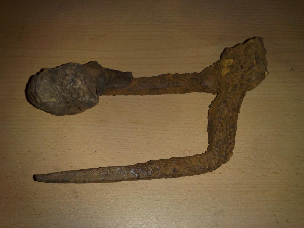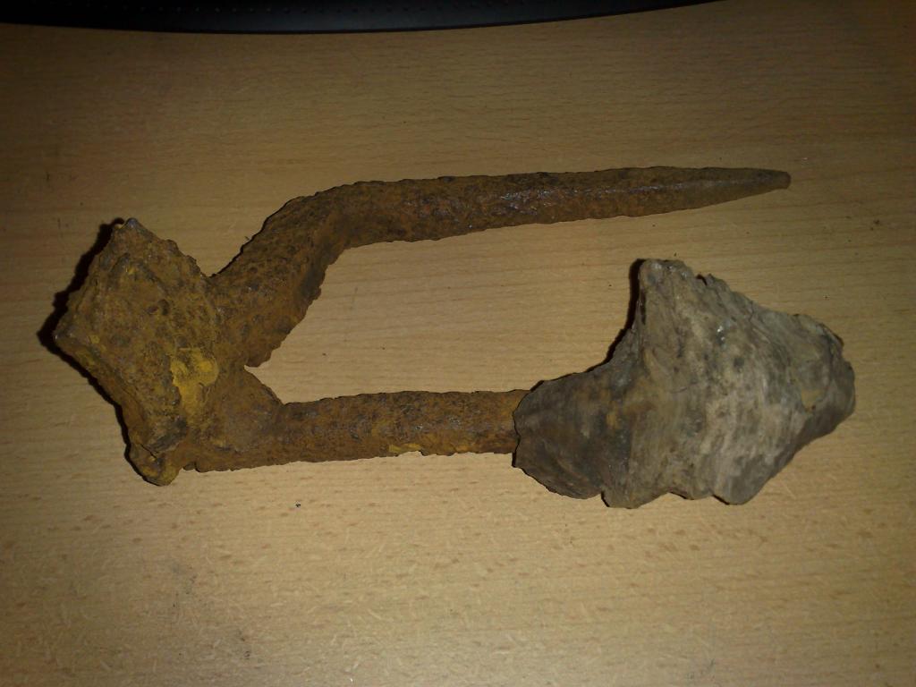 hab hier ein teil einer Heugabel sieht ziemlich alt aus, an der einen Spitze steckt Holz drauf. Das Holz muss ich sagen is teilweise steinhart und sitzt absolut fest drauf, also kein abnehmen ohne es zu beschädigen.
