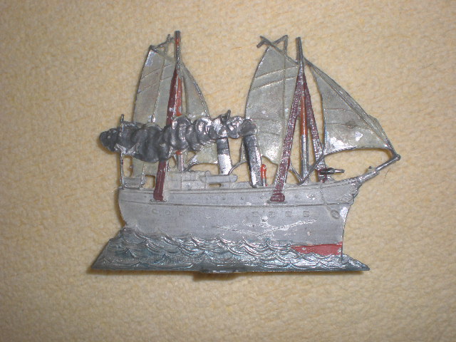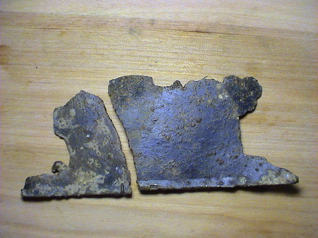 hab ich auch noch gefunden. Die 2 Teile lagen etwa 5m. auseinander. Insgesamt 10 x 4cm. groß. Ein Schiff mit Kanonen.Spielzeug für Zinnsoldaten?