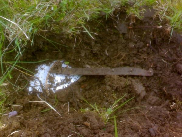 verrückt gespielt!!!Also mal gebuddelt....siehe da ein Messer ca. 25 cm lang liegend auf einem umgeedrehten Teller.....