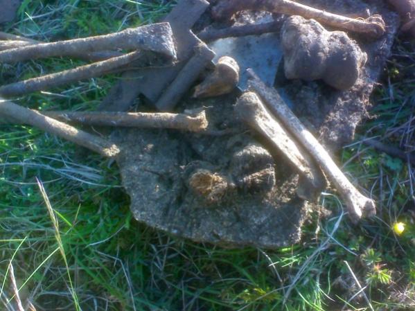Zum Teil waren auch recht viele Knochen dabei, welche meiner Meinung allerdings zu klein waren um von Menschen zu stammen. Außerdem Konservendosen, natürlich total verrostet.Als ich dann allerdings einen großen Wirbel fand waren die Grabe arbeiten erst mal beendet.