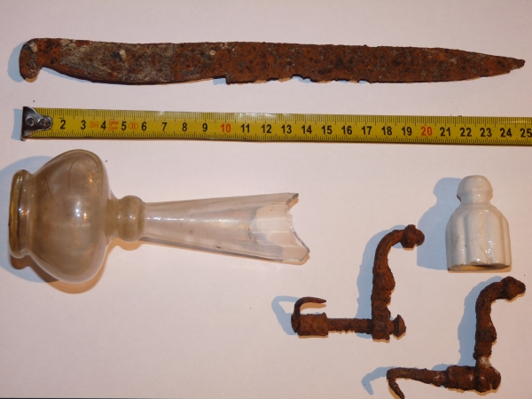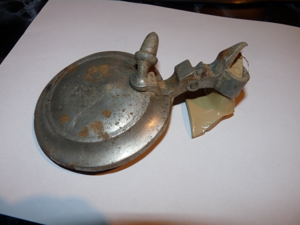 kam mir dann schon etwas merkwürdig vor, nach weiterem Graben könnte ich dann einen Zinndeckel eines Bierkruges (´G E Gravur,sehr schlicht) eine Art Vase aus Glas, evtl.einen Salzstreuer aus Keramik???, Tonscherben, Glasscherben, einen Perlmuttknopf,verschiedene Metallstangen, eine Stempelbremse??? und zig diverse Metallteile Bergen...