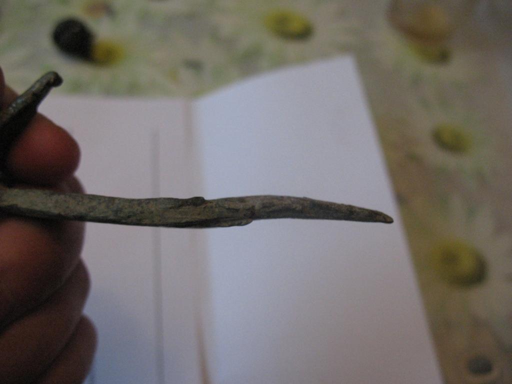 Material scheint Bronze oder ein anderes Edel/buntmetall zu sein.. an der Spitze schimmert es silbern/grau und an der Stelle, wo mein Spaten zugeschlagen hat, leicht rötlich wie kupfer/messing?!
