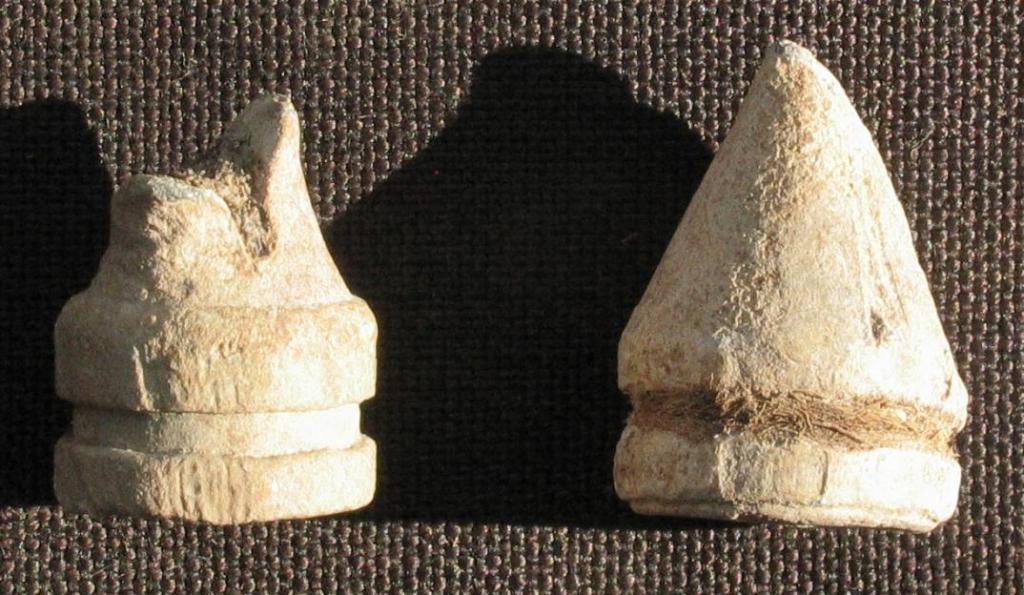 Linke Spitzkugel 17gr 14mm im Durschm. ca. 18mm lang mit dicht aneinander liegenden Riefen an 2 Stellen, an der Spitze mit Gesteinseinschluß vom Aufschlag. Rechte Spitzkugel 22gr. 15mm im Durchm. 22mm lang mit aufgeworfenen ca. 2mm breiten Riefen im Abstand von ca. 4mm, hier ist in der Nut noch Dichtschnur erkennbar.