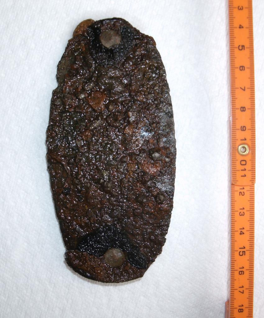 Bild 1 + 2 Vorderseite, Bild 3 Rückseite. Zu sehen sind zwei starke Nieten oben und unten sowie an den Nieten vorhandene Holzreste.