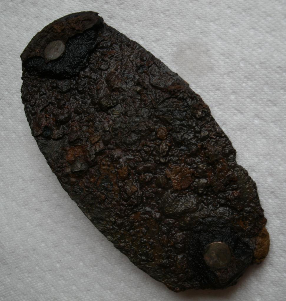 Gibt es jemanden der diese Metallplatte mit Nieten einordnen kann? Fundort: In einem Wald wo deutsche Soldaten abgerüstet haben.