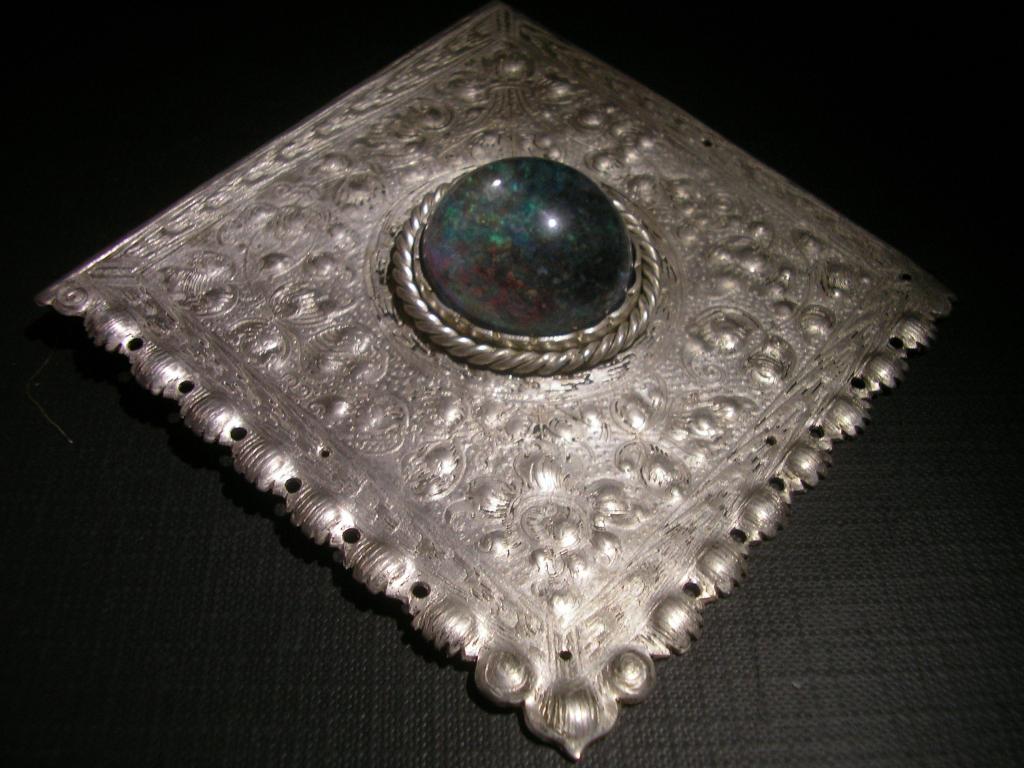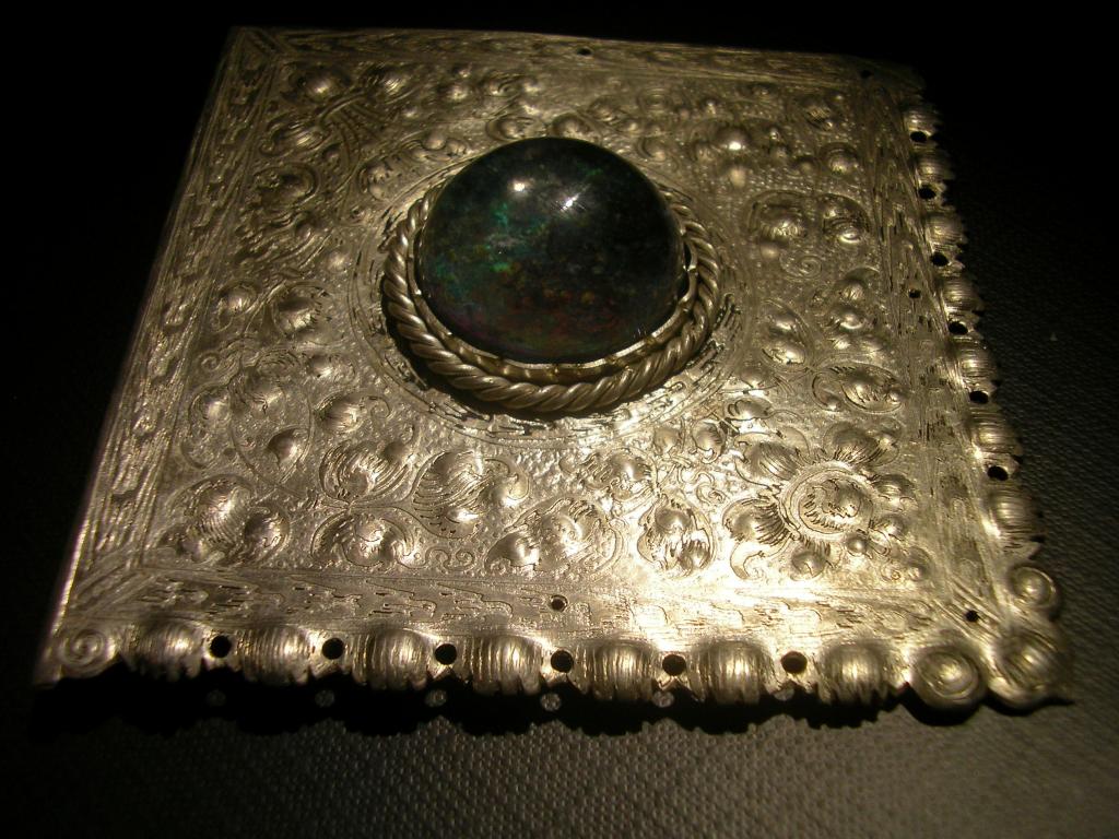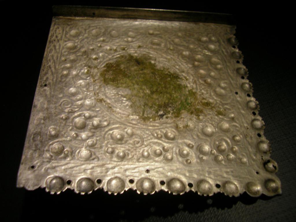 Unmagnetisch silbrig glänzendes Blech mit Prägung und einer Glashalbkugel.
