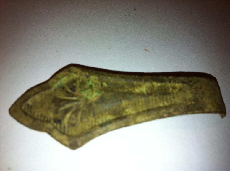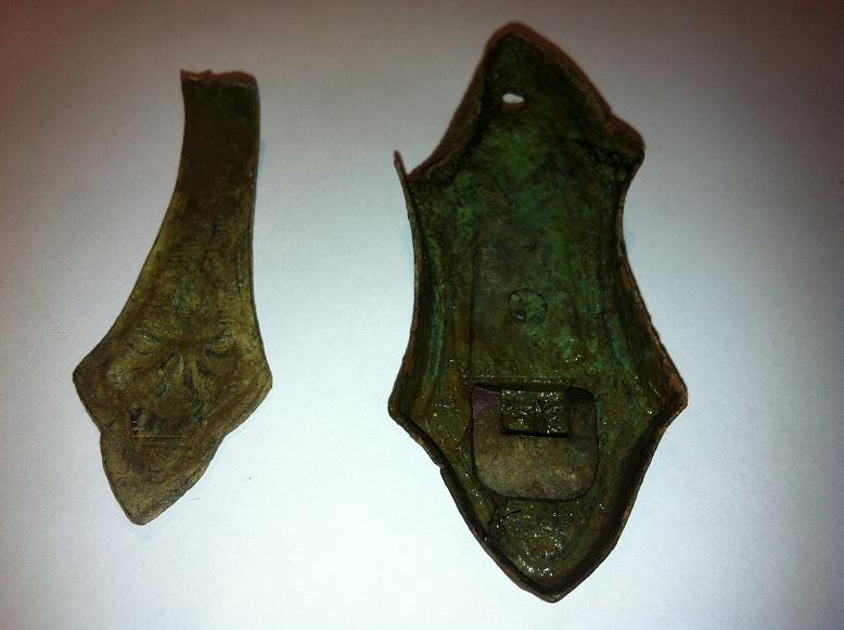 Eine Art Kleiderhaken, wenn man das so nennen kann. Es ist mir leider unabsichtlich in 2 Teile gebrochen. Es scheint als wäre es aus Kupfer durch die Grünfärbung. Das kleinere war um 180 Grad gebogen und verlief dann parallel zu dem großen. Auf der Rückseite scheint eine Art Aufhängung zu sein(Bild2)
