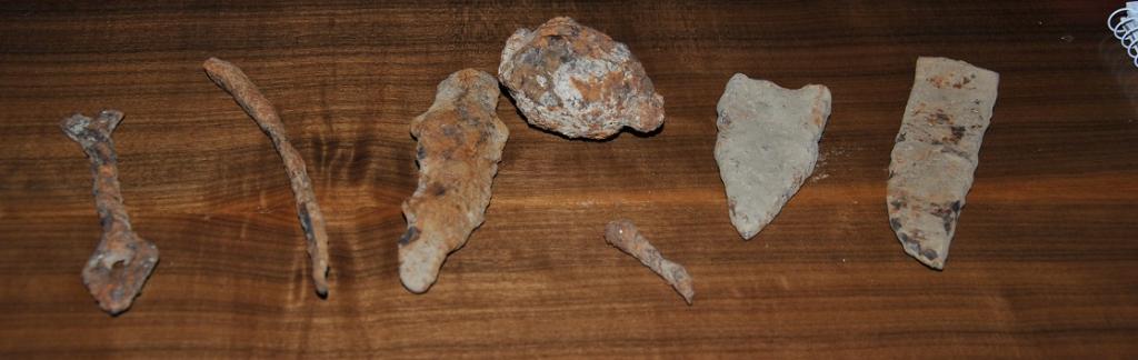 eine "Speerspitze mit Loch"; schmales spitziges UFO; "Speerspitze" groß; eine "Handgranate" klein (ca. 300 gr.); "Spitze eines (römischen)) Kurzschwert; "Spitze einer Säbel"