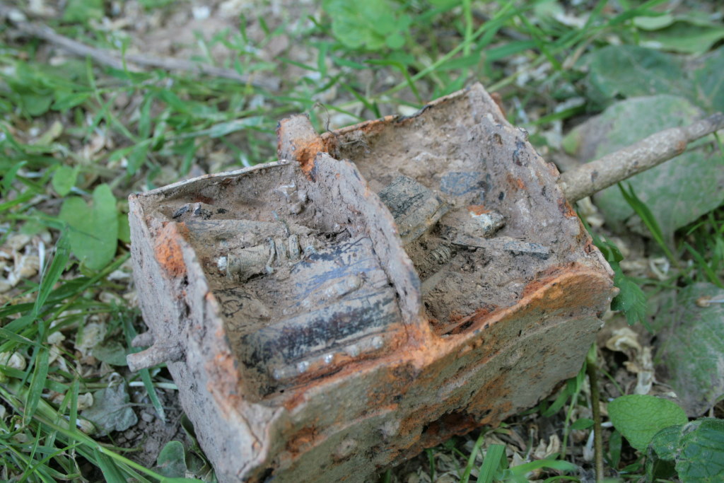 Fundort ist ein Acker in Niedersachsen. Es kann vom Gebiet her ein militärischer Fund sein, aber auch ein neuzeitlicher Ventilator / Heizung, welche dem Bauern vom Trecker abgefallen ist. Möglicherweise waren da Mal zwei Walzen oder Trommeln mit Lamellen drin, man sieht auch uralte Elektrik. Der Stab scheint durch zu gehen. Die Feder (zweites Bild) war unter dem geriffelten Alurad. Größe ist geschätzt ca. 20 cm.