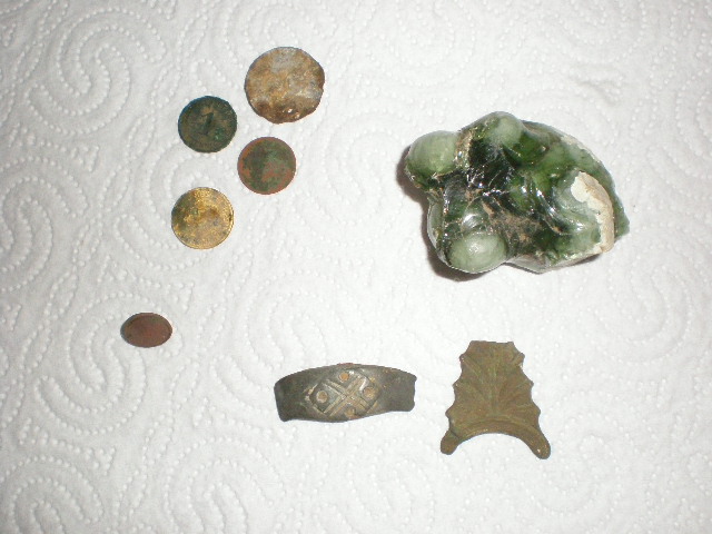 ) und Musketenkugeln ( nicht auf dem Bild). Ein kleiner Knopf , Schnallenbruchstück, Beschlag ? und ein Lesefund.