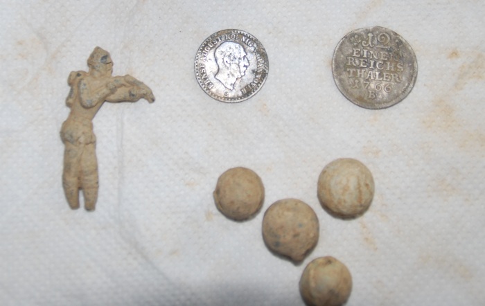 Hier nochmals ein Foto von der Halbkugel mit dem Loch (ich vermute immer noch eine Handgranate), sowie zwei weitere Funde. (Zinnsoldat und Münzen von 1766 Reichs Thaler und von König Ernst August von Hannover von 1843).