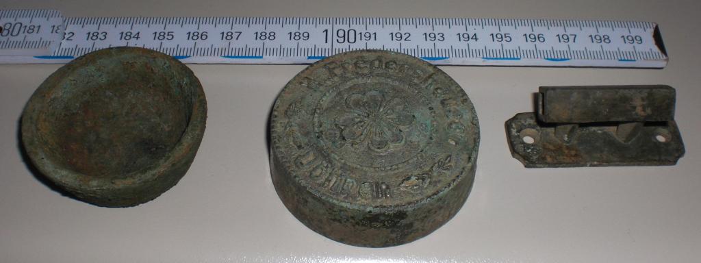 unter anderm habe ich heute diese drei Teile gefunden, wo ich aufjeden Fall sagen kann, dass es sich bei dem mitteleren Teil um einen Fahrrad Klingeldeckel der Firma "H. Fredershausen, Döhren" handelt.