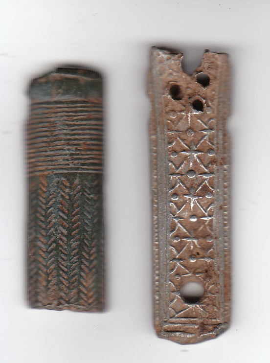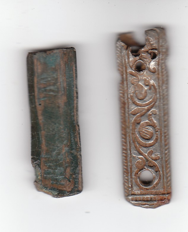 dachte beim rechten teil könnte es sich um eine riemenzunge handeln, ist innen hohl und möglicherw.versilbert L = 50 mm (abgebrochen) B= 14 mm