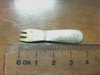Ich weiß nicht, woher -aber irgendwo hab ich sowas schonmal gesehen.Von der Größe her sieht es aus wie eine Frittengabel (nur sind die aus Holz).Sieht man Bearbeitungsspuren? Ist das Teil gestanzt und symmetrisch oder irgendwie gefeilt und unsymmetrisch.Falls ersteres zutreffen sollte:Könnte aus US-Army Versorgung für Kriegsgefangene deutsche Soldaten stammen....So a la "CARE"-Paket.