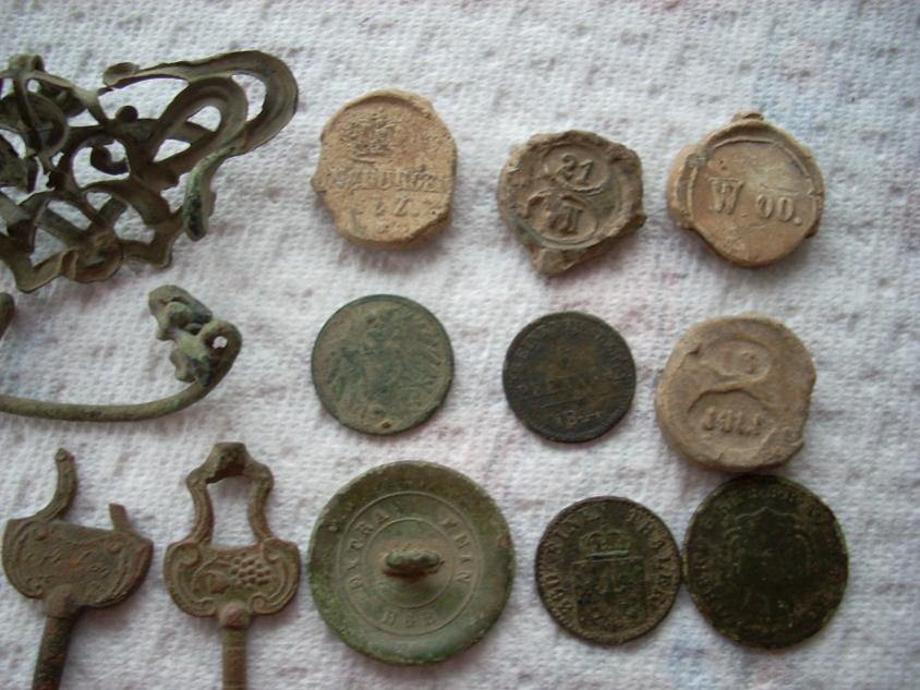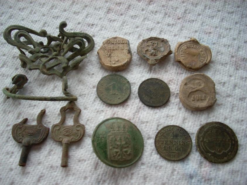 1 Möbelbeschlag, darunter Möbelgriff. 4 Saatgutplomben Ende 19. Jhdt.; 1 Reichspfennig, 1 Pfennig 19. Jhdt. (1854? Preussen...), 2 Uhrenschlüssel 19 Jhdt., 1 Preussichscher (Armee-)Knopf, noch n´Reichspfennig 1867, 1 Kreuzer 18. Jhdt. (Hessen?)