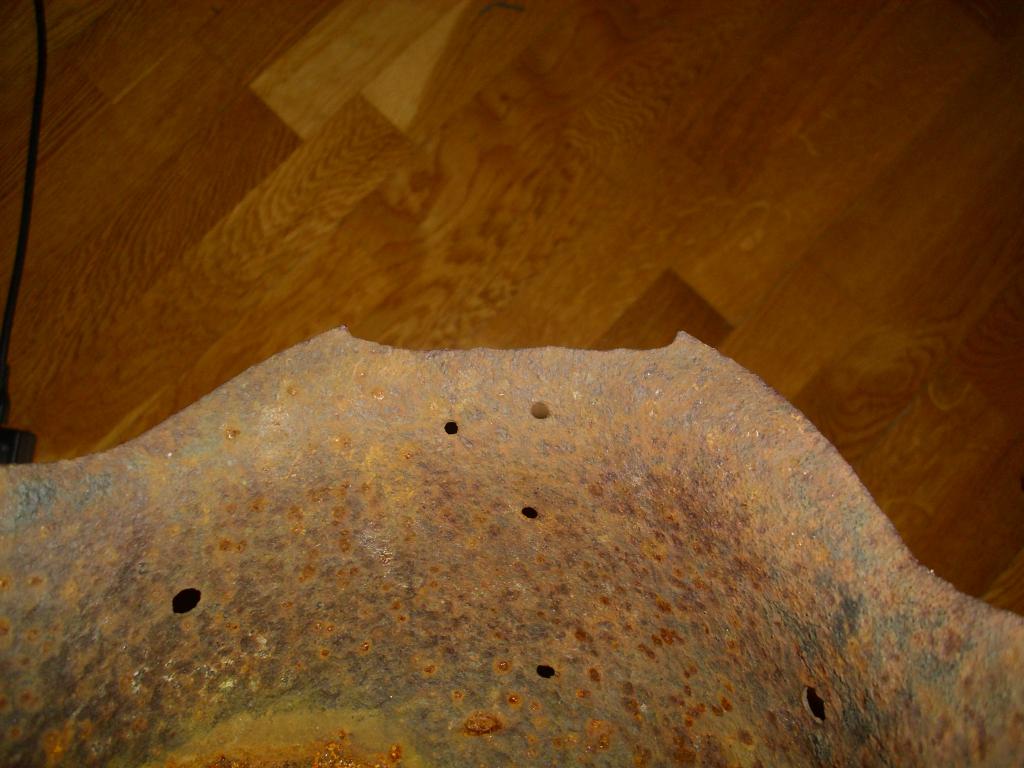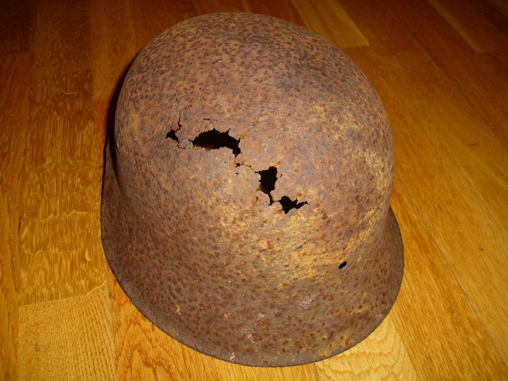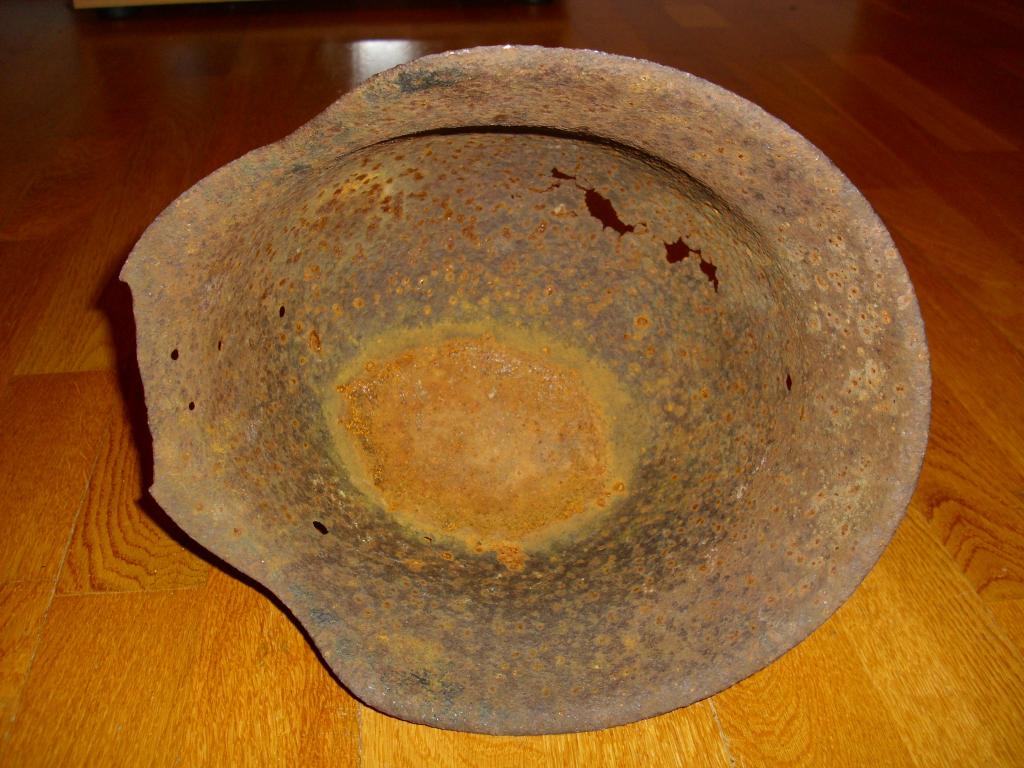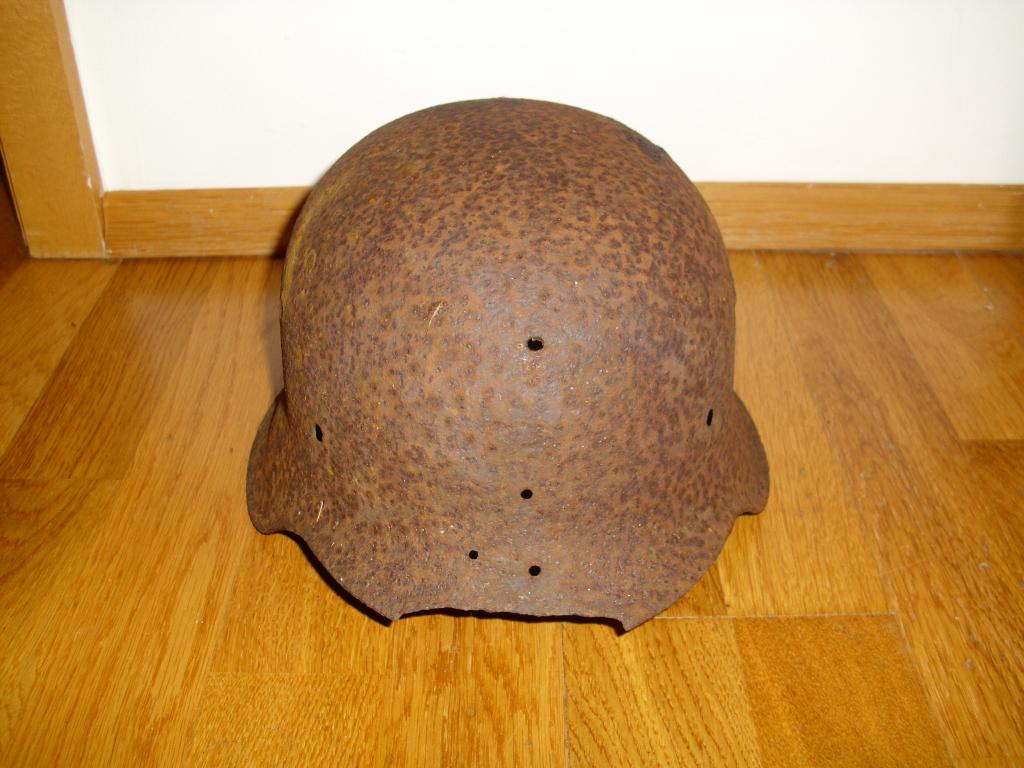 Was mir an dem Helm merkwürdig erscheint, sind die vier Löcher an der Vorderseite des Helmes (KEINE Durchrostung, sieht nach Bohrung oder Stanzung aus!)