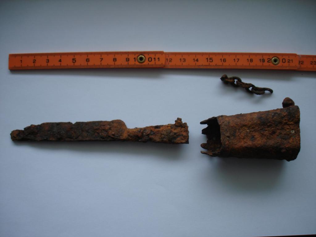 Hm, etwas ähnliches wurde mir mal als Schließriegel eines Tores identifiziert - das längliche Teil ist im Querschnitt ein spitzes Dreieck und ziemlich massiv nehme ich an?