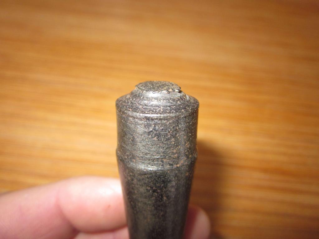 Es ist 85mm lang, Durchmesser 20mm verjüngt sich auf 12mm ist auf der einen Seite spitz angeschliffen. Die andere Seite zeigt Schlagspuren ( etwas aufgepilst ). Könnte ein Dorn zum austreiben sein. Ist dafür aber meiner Meinung nach ziehmlich aufwenig gearbeitet , da der verjüngte Teil geschmiedet wurde. Wenn man mit dem Finger drüber fährt spürt man die Schlagspuren.